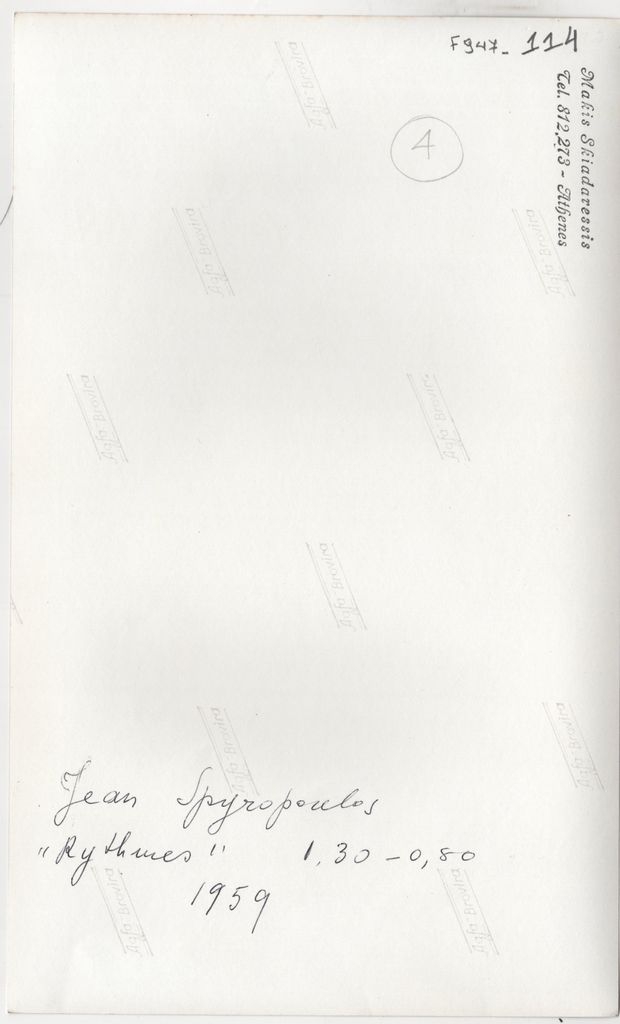 Φωτογραφία, α/μ, φωτογραφικό χαρτί, 23,3×14,2 εκ. Αναπαραγωγή του έργου του Γιάννη Σπυρόπουλου “Ρυθμοί”, 1959. Στην πίσω όψη, επιγραφή με τα στοιχεία του έργου και σφραγίδα του φωτογράφου Μάκη Σκιαδαρέση.