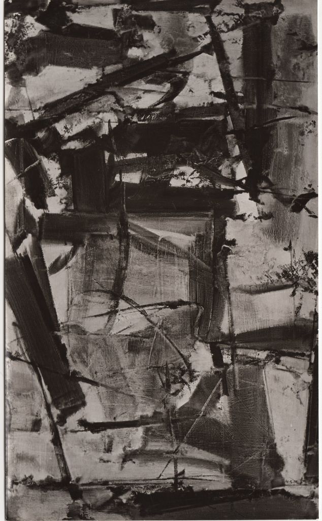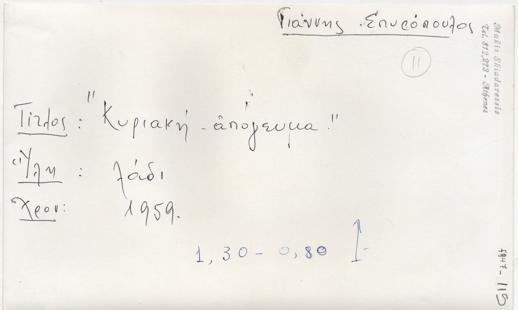 Φωτογραφία, α/μ, φωτογραφικό χαρτί, 14,0×23,3 εκ. Αναπαραγωγή του έργου του Γιάννη Σπυρόπουλου “Κυριακή απόγευμα”, λάδι, 1959. Στην πίσω όψη, επιγραφή με τα στοιχεία του έργου και σφραγίδα του φωτογράφου Μάκη Σκιαδαρέση.