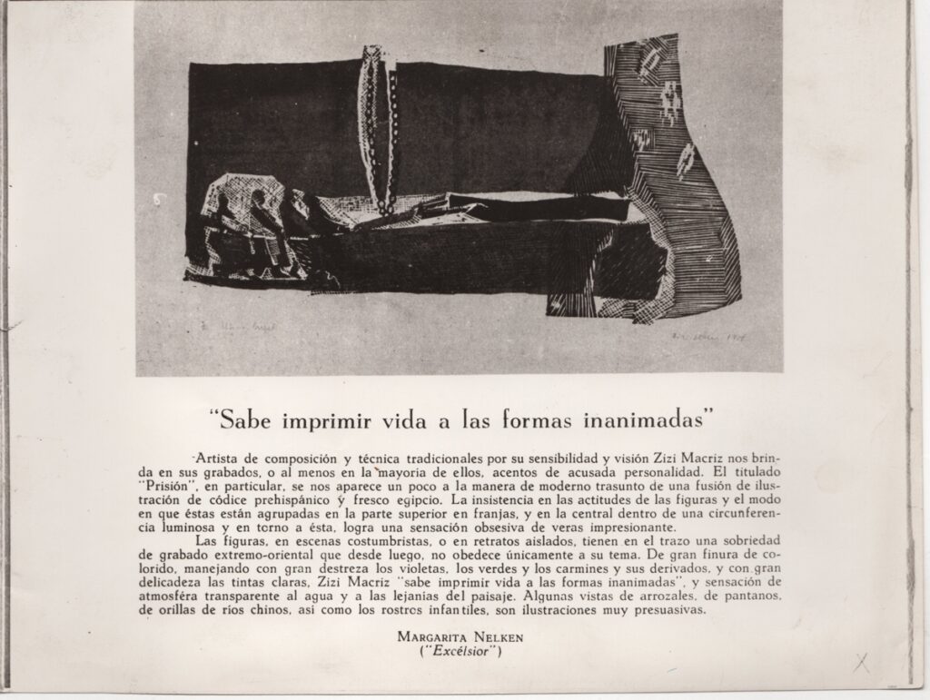Φωτογραφία, α/μ, σε φωτογραφικό χαρτί, 18,2×24,0 εκ. Απόσπασμα κριτικής της Margarita Nelken, στα ισπανικά, για το έργο της χαράκτριας Ζιζή Μακρή. Εικονογραφείται με αναπαραγωγή έργου.