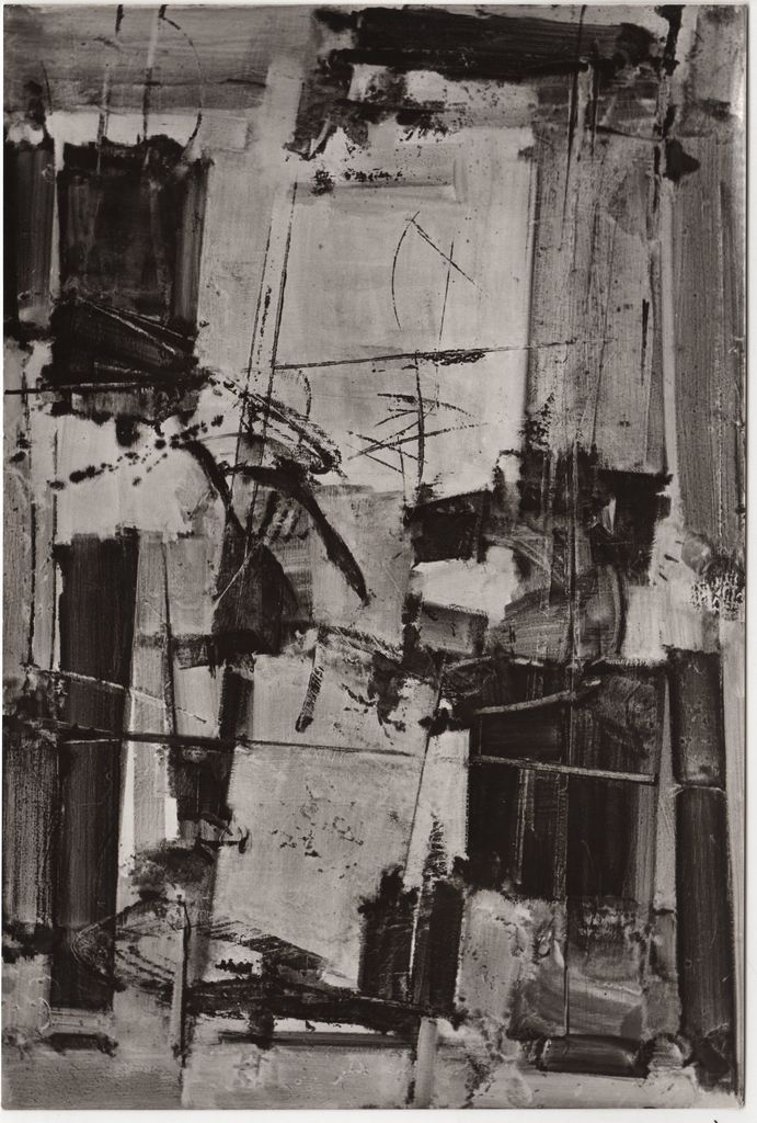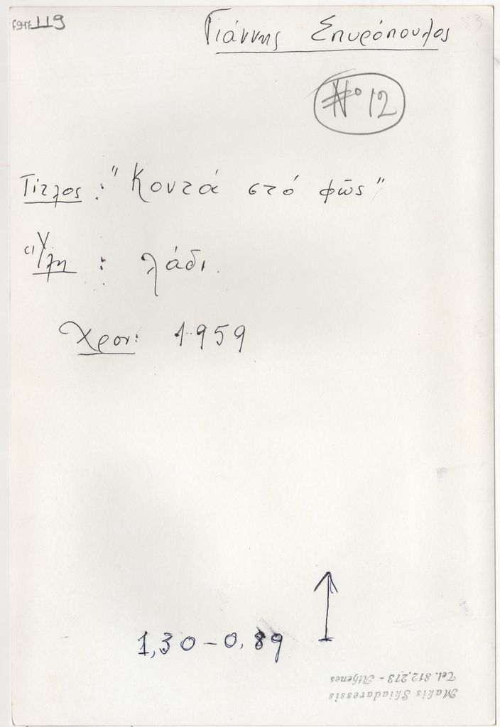 Φωτογραφία, α/μ, φωτογραφικό χαρτί, 23,6×13,7 εκ. Αναπαραγωγή του έργου του Γιάννη Σπυρόπουλου “Κοντά στο φως”, λάδι, 1959. Στην πίσω όψη, επιγραφή με τα στοιχεία του έργου και σφραγίδα του φωτογράφου Μάκη Σκιαδαρέση.