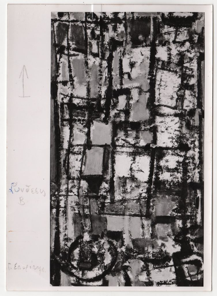 Φωτογραφία, α/μ, φωτογραφικό χαρτί, 18,3×13,0 εκ. Αναπαραγωγή του έργου του Γιάννη Σπυρόπουλου “Σύνθεση Β”. Στην εμπρόσθια όψη, επιγραφή με τον τίτλο του έργου.