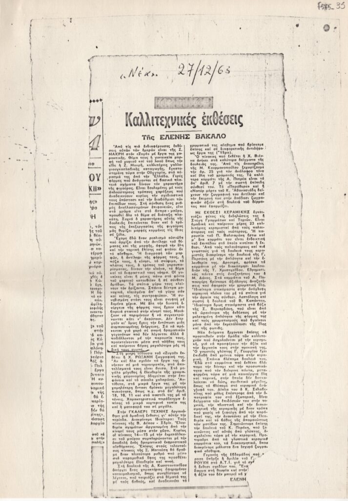 Φωτοαντίγραφο αποκόμματος εφημερίδας, στα ελληνικά, χαρτί, 29,8×21,0 εκ. Κριτική των εκθέσεων της περιόδου από την Ελένη Βακαλό. Σχολιάζονται η ατομική έκθεση χαρακτικής της Ζιζής Μακρή, η ατομική έκθεση ζωγραφικής της Χρυσούλας Ρωξάνη, η ομαδική έκθεση ζωγραφικής με έργα των Β. Δέπου-Σδρίν, Ξ. Ματούση, Δ. Κωνσταντινίδου, Χ. Βιέννα, Μ. Κουρμανοπούλου, Α. Πετρέα και Κ. Αθηανασιάση, την ομαδική έκθεση κεραμικής με συμμετοχή 23 κεραμιστών (Π. Βαλσαμάκης, Γ. Περσάκη, Τ. Χρυσοχοΐδου, Μ. Δάνος, Α. Παπαυγέρης, Β. Καπάνταη, Σ. Βερναδάκη, Γ. Γεωργίου, Κ. Σκλαβενίτη, Κ. Περάκη κ.ά. Τέλος, αναφέρεται η ομιλία του Γ. Τσαρούχη για το σχέδιο στην έκθεση σχεδίων του. Επάνω, επιγραφή με τα στοιχεία της δημοσίευσης.