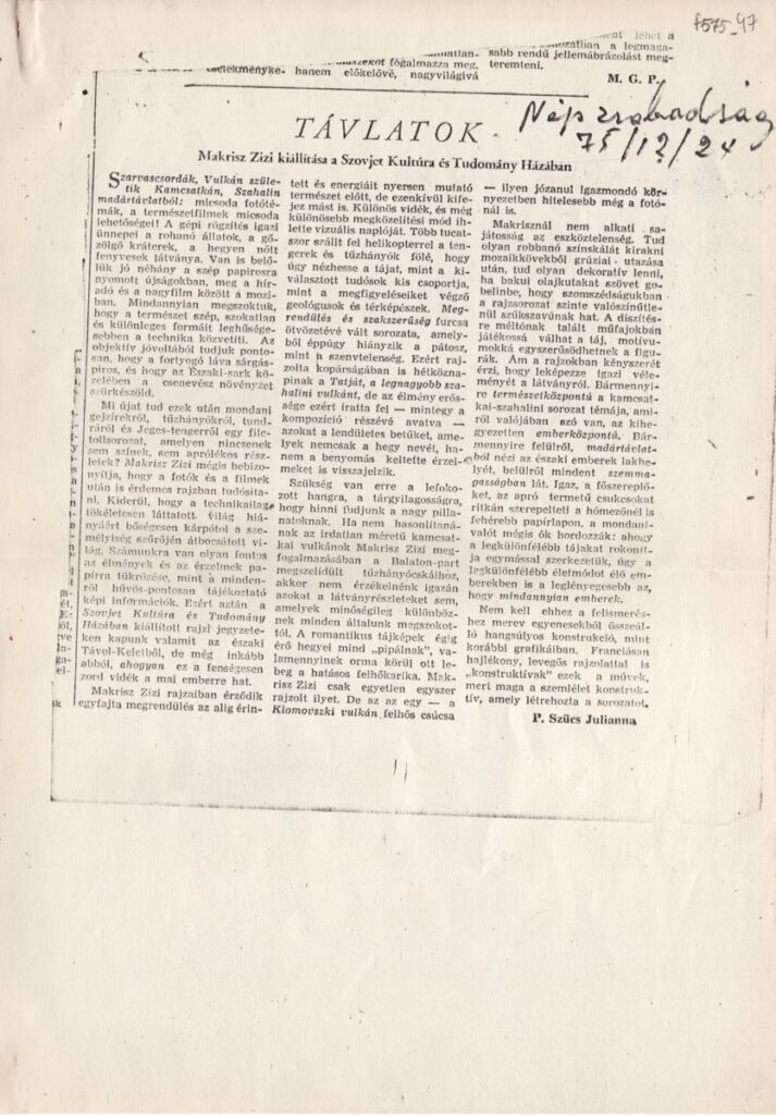Φωτοαντίγραφο αποκόμματος εντύπου, στα ουγγρικά, χαρτί, 29,8×21,0 εκ. Κριτική της Julianna P. Szücs για την ατομική έκθεση της Ζιζής Μακρή στη Βουδαπέστη το 1975. Επάνω επιγραφή με τα στοιχεία της δημοσίευσης.