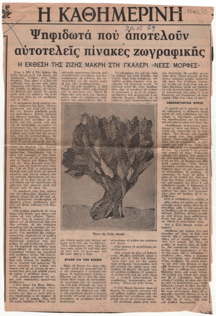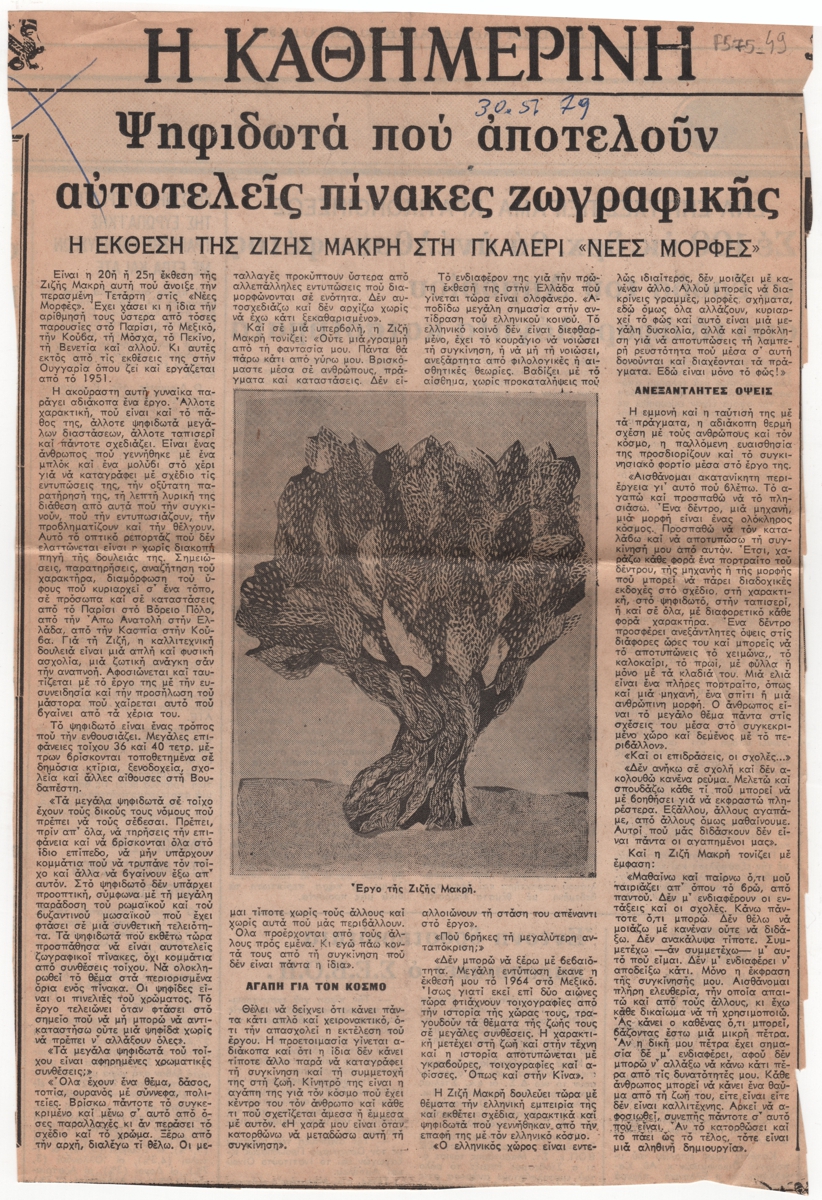 Απόκομμα, έντυπο, στα ελληνικά, χαρτί, 30,5×20,7 εκ. Κριτική για την ατομική έκθεση της Ζιζής Μακρή στην Αθήνα το 1979. Περιέχει εκτενή αποσπάσματα συνέντευξης της καλλιτέχνιδας. Εικονογραφείται με αναπαραγωγή έργου. Επάνω, επιγραφή με την ημερομηνία της δημοσίευσης. Στην πίσω όψη οικονομική επικαιρότητα.