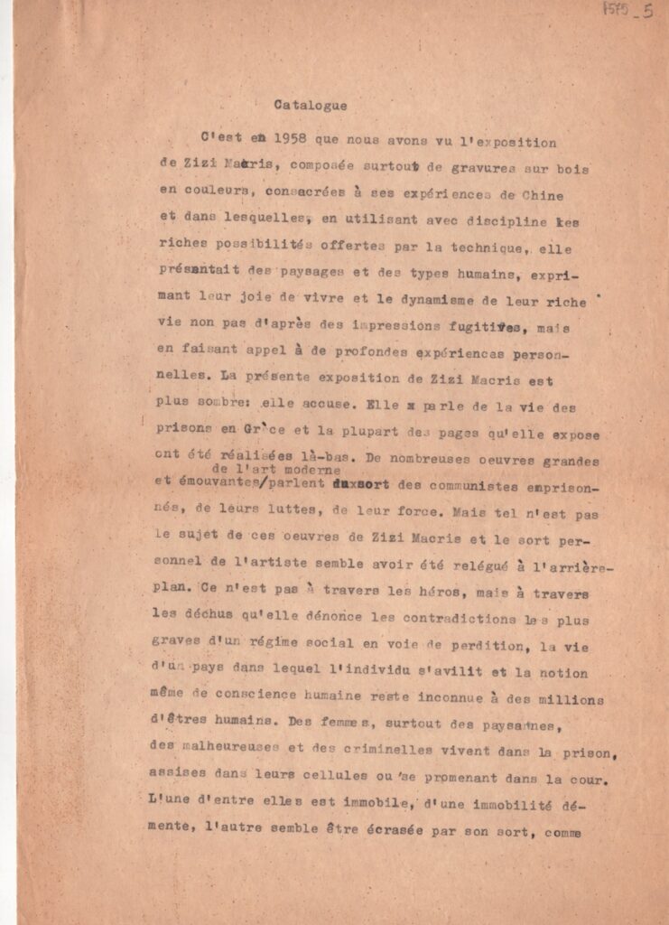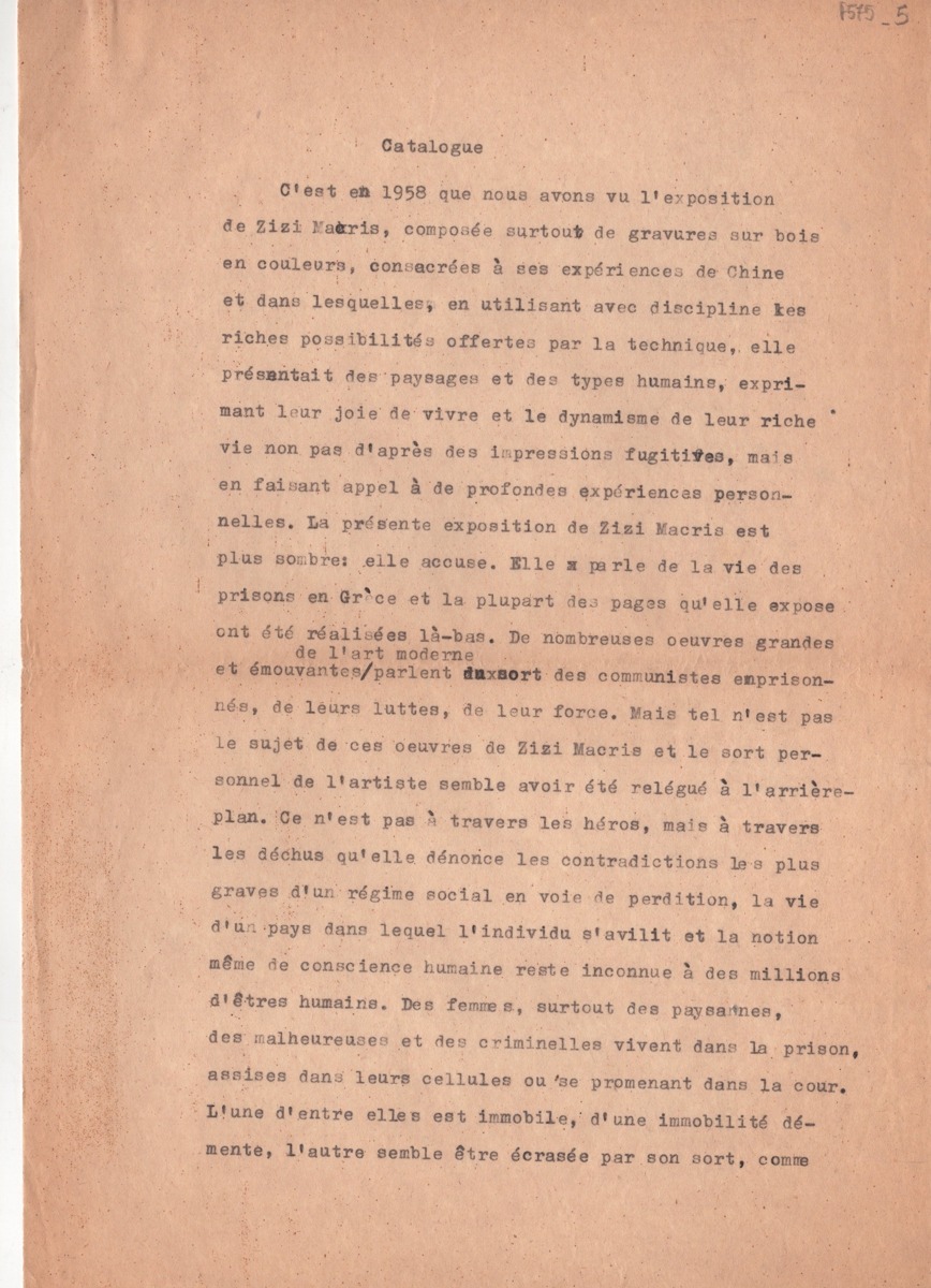 Κείμενο, δακτυλόγραφο, στα γαλλικά, χαρτί, 3 φφ., 30,0×21,0 εκ. Γαλλική μετάφραση του ουγγρικού κειμένου της Nóra Aradi, που περιλαμβάνεται στο κατάλογο της ατομικής έκθεσης χαρακτικής της Ζιζής Μακρή στη Βουδαπέστη το 1962.