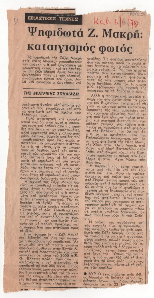 Απόκομμα, έντυπο, στα ελληνικά, χαρτί, 21,8×11,3 εκ. Κριτική της Βεατρίκης Σπηλιάδης για την ατομική έκθεση ψηφιδωτών της Ζιζής Μακρή στην Αθήνα το 1979. Επάνω επιγραφή με τα στοιχεία της δημοσίευσης.