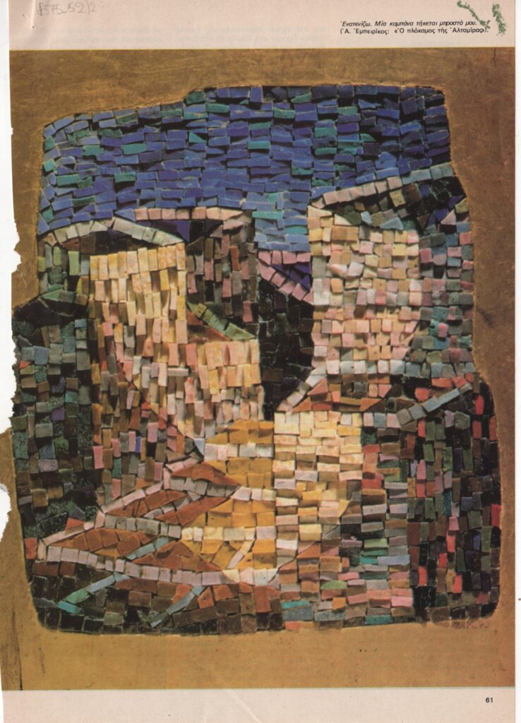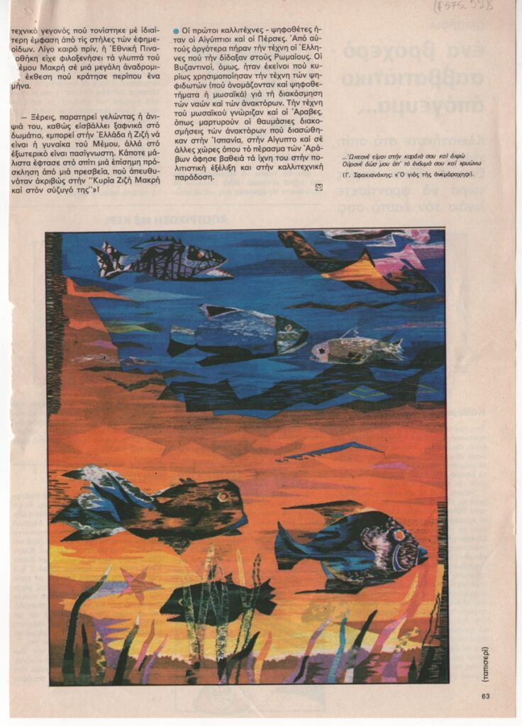 Απόκομμα περιοδικού, στα ελληνικά, χαρτί, 3 φφ., 27,8×19,8 εκ. Συνέντευξη της Ζιζής Μακρή στην Κατ. Δ. με θέμα το καλλιτεχνικό της έργο και επίκεντρο τα ψηφιδωτά. Στο κείμενο περιλαμβάνονται αποσπάσματα ποιημάτων του Οδ. Ελύτη από το έργο “Ο Φυλλομάντης”, του Α. Εμπειρίκου από το έργο “Ο πλόκαμος της Αλατμίρας” και του Γ. Σφακιανάκη από το έργο “Ο γιος της ανεμόραχης”. Εικονογραφείται με αναπαραγωγή έργων και φωτογραφίας της καλλιτέχνιδας. Στην πρώτη σελίδα επιγραφή με τα στοιχεία της δημοσίευσης