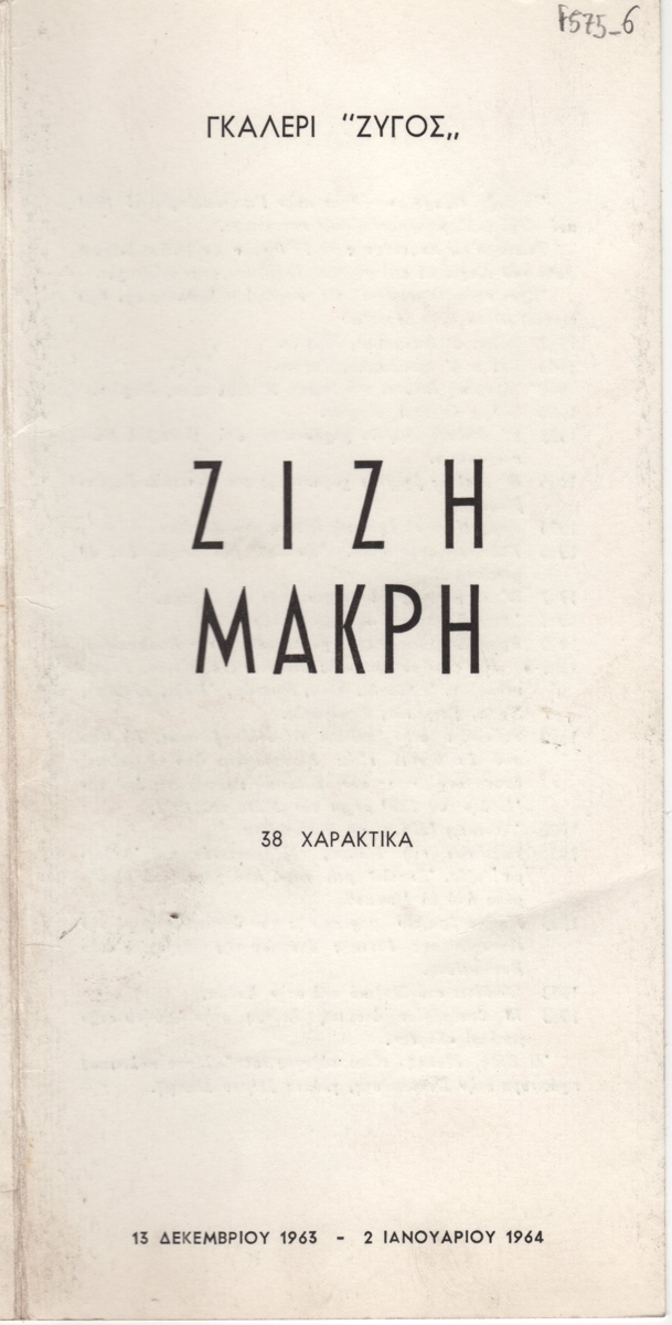 Έντυπο, στα ελληνικά, τρίπτυχο, χαρτόνι, 21,6×10,5 εκ. Έντυπο από την ατομική έκθεση χαρακτικής της Ζιζής Μακρή στην Αθήνα το 1963. Περιέχει βιογραφικό σημείωμα της καλλιτέχνιδας με αναφορά σε ατομικές, ομαδικές εκθέσεις και βραβεία και τιμοκατάλογο έργων. Στην πίσω σελίδα επιγραφές με βιογραφικά στοιχεία.