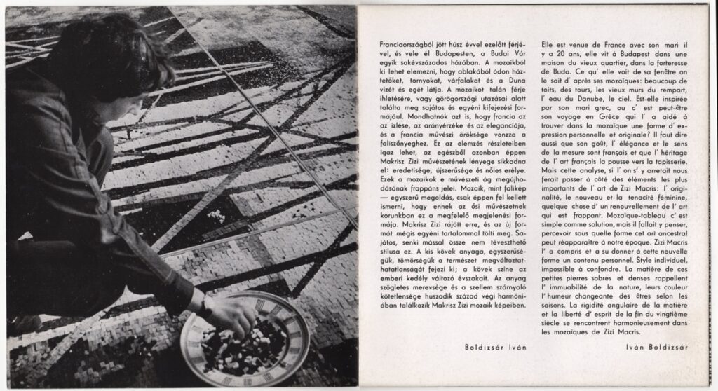 Έντυπο, στα ουγγρικά και γαλλικά, χαρτόνι και χαρτί, 22,5×20,6 εκ. Κατάλογος της ατομικής έκθεσης χαρακτικών, σχεδίων και ψηφιδωτών της Ζιζής Μακρή στην Βουδαπέστη. Περιέχει κείμενο του Iván Boldizsár για την καλλιτέχνη και το έργο της. Εικονογραφείται με αναπαραγωγή έργων και φωτογραφίας της καλλιτέχνιδας.