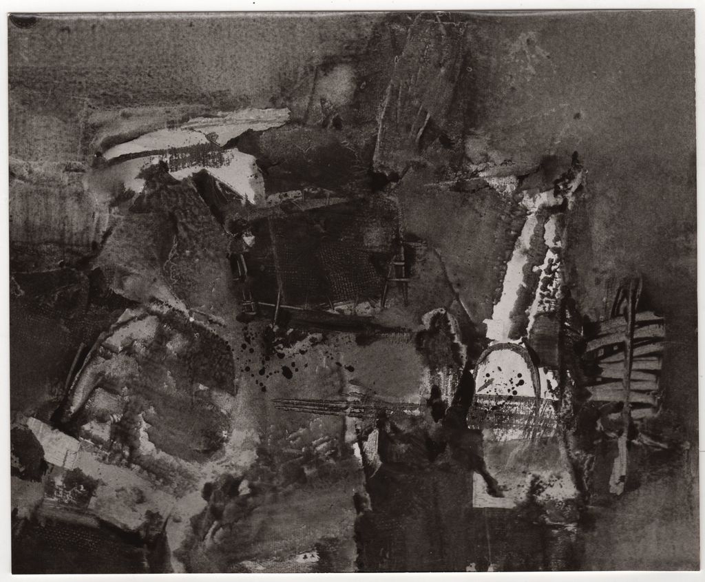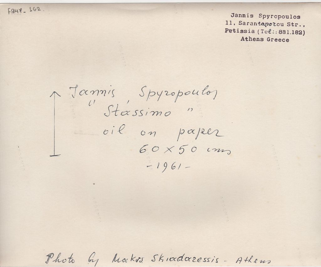 Φωτογραφία, α/μ, φωτογραφικό χαρτί, 17,3×21,2 εκ. Αναπαραγωγή του έργου του Γιάννη Σπυρόπουλου “Στάσιμο”, λάδι σε χαρτί, 1961. Στην πίσω όψη, επιγραφή με τα στοιχεία του έργου και σφραγίδα του καλλιτέχνη.