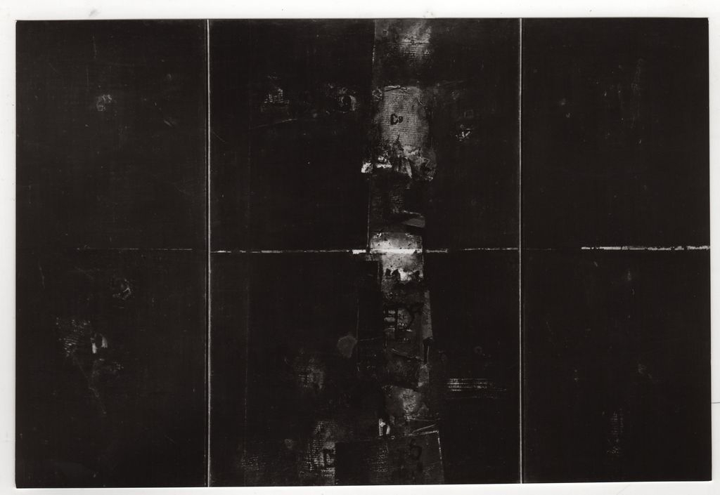 Φωτογραφία, α/μ, φωτογραφικό χαρτί, 23,7×15,5 εκ. Αναπαραγωγή του έργου του Γιάννη Σπυρόπουλου “Τρίπτυχο Β”, λάδι σε καμβά, 1964. Στην πίσω όψη, επιγραφή με τα στοιχεία του έργου και σφραγίδα του καλλιτέχνη.