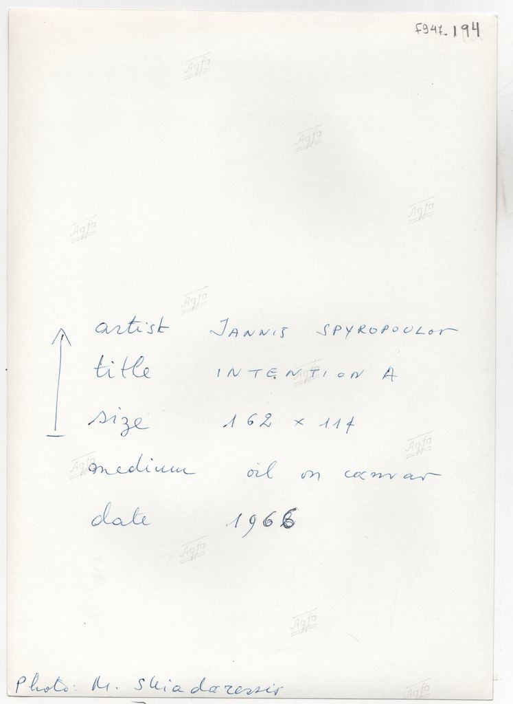 Φωτογραφία, α/μ, φωτογραφικό χαρτί, 23,2×16,4 εκ. Αναπαραγωγή του έργου του Γιάννη Σπυρόπουλου “Πρόθεση Α”, λάδι σε καμβά, 1966. Στην πίσω όψη, επιγραφή με τα στοιχεία του έργου.