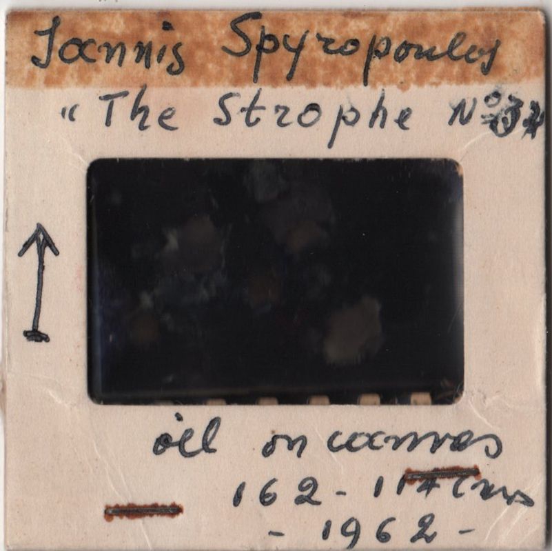 Διαφάνεια, έγχρωμη, 2,3×3,5 εκ., σε χάρτινο πλαίσιο, 5,0×5,0 εκ. Αναπαραγωγή έργου του Γιάννη Σπυρόπουλου. Στο πλαίσιο, επιγραφές με τα στοιχεία του έργου.