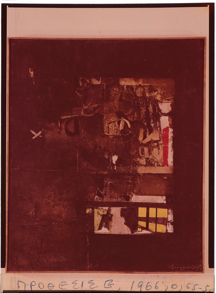 Διαφάνεια, έγχρωμη, 18,7×12,7 εκ. Αναπαραγωγή του έργου του Γιάννη Σπυρόπουλου “Πρόθεσις Ε”, λάδι σε καμβά, 1966. Επικολλημένο απόκομμα χαρτιού με δακτυλόγραφη λεζάντα, στα γαλλικά: Jannis Spyropoulos PROTHESSIS E, huil sur toils, 9,65×0,54. Στο κάτω μέρος της διαφάνειας, επιγραφή.