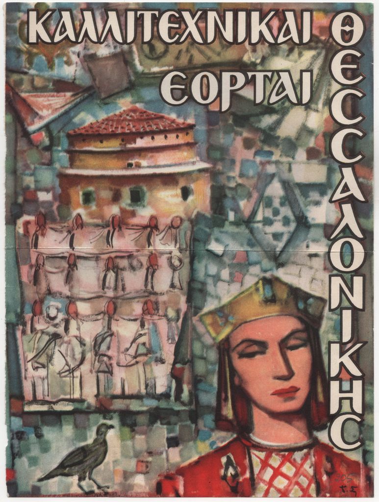 Απόκομμα, έντυπο, χαρτί, 28,3×21,2 εκ. Εξώφυλλο εντύπου της διοργάνωσης “Καλλιτεχνικαί εορταί Θεσσαλονίκης”, που διοργανώθηκαν τον Σεπτέμβριο του 1958 (23-28/09), όπου αναπαράγεται έργο του Γιάννη Σβορώνου. Το έργο αποτελεί αναφορά στην παράσταση του έργου του Άγγελου Τερζάκη “Θεοφανώ” με το οποίο άνοιξαν οι εκδηλώσεις. Στην πίσω όψη διαφήμιση της εταιρίας φυσικού αερίου “Ατζιπ-Γκαζ”