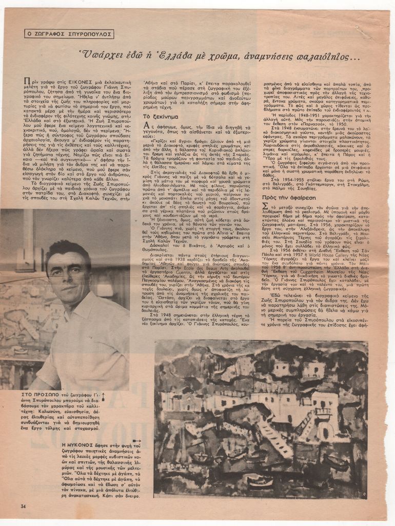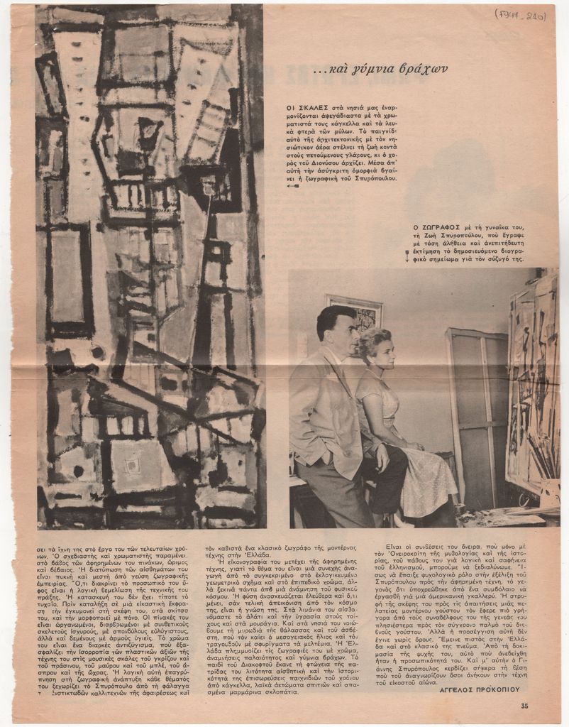 Απόκομμα, έντυπο, χαρτί, 2 φφ., 32,0×24,3 εκ., όπου δημοσιεύεται, στα ελληνικά, άρθρο του Άγγελου Προκοπίου για τον ζωγράφο Γιάννη Σπυρόπουλο. . Στην πρώτη σελίδα, επιγραφή με τα στοιχεία της δημοσίευσης.