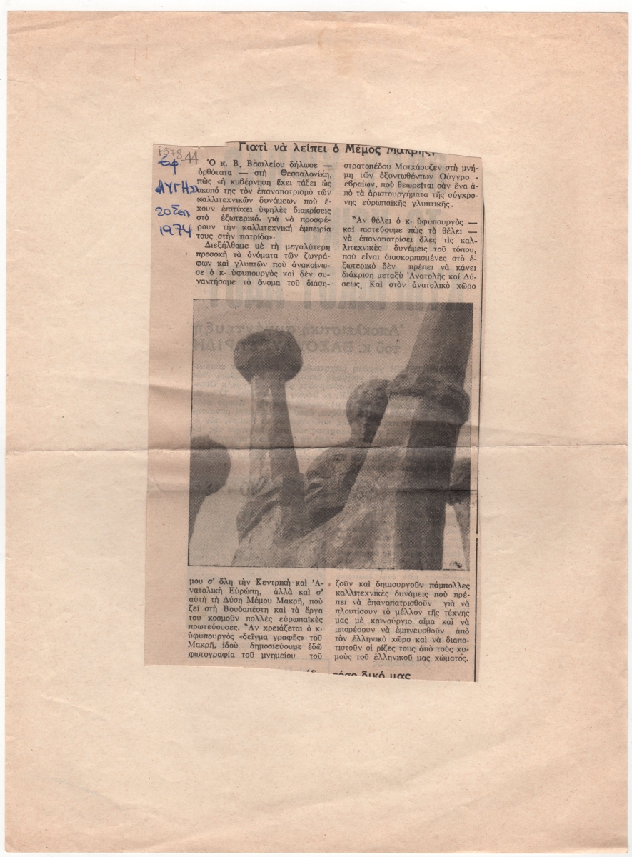 Απόκομμα, έντυπο, στα ελληνικά, χαρτί, 18,2×11,5 εκ. Δημοσίευμα σχετικά με την εξαίρεση του γλύπτη Μέμου Μακρή από την ομιλία του Βάσου Βασιλείου στη Θεσσαλονίκη, σχετικά με την πρόθεση της κυβέρνησης εθνικής ενότητας να επιδιώξει τον επαναπατρισμό των ελλήνων καλλιτεχνών από το εξωτερικό. Εικονογραφείται με αναπαραγωγή έργου. Αριστερά, επιγραφή με τα στοιχεία της δημοσίευσης.