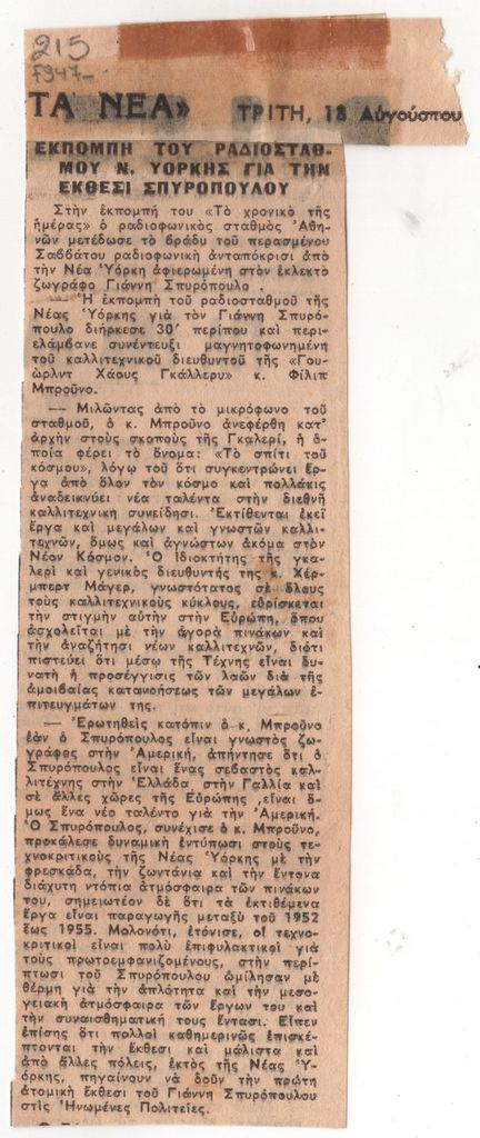 Απόκομμα, έντυπο, χαρτί, 17,0×5,0 εκ. (ακανόνιστο σχήμα), όπου δημοσιεύεται, στα ελληνικά, η είδηση της μετάδοσης της ραδιοφωνικής εκπομπής “Το χρονικό της ημέρας” από τον ραδιοφωνικό σταθμό Αθηνών με ραδιοφωνική ανταπόκριση από τη Νέα Υόρκη σχετικά με την ατομική έκθεση έργων του ζωγράφου Γιάννη Σπυρόπουλου το 1959.