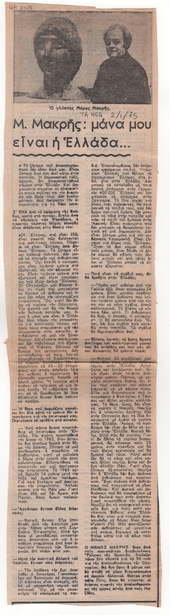 Απόκομμα εφημερίδας, στα ελληνικά, χαρτί, 37,7×10,3 εκ. Συνέντευξη του γλύπτη Μέμου Μακρή σχετικά με την απόδοση της ελληνικής ιθαγένειας, που του είχε αφαιρεθεί το 1963 και την πιθανότητα επαναπατρισμού του από την Ουγγαρία. Εικονογραφείται με αναπαραγωγή φωτογραφίας του καλλιτέχνη δίπλα σε έργο του. Επάνω, επιγραφή με τα στοιχεία της δημοσίευσης.