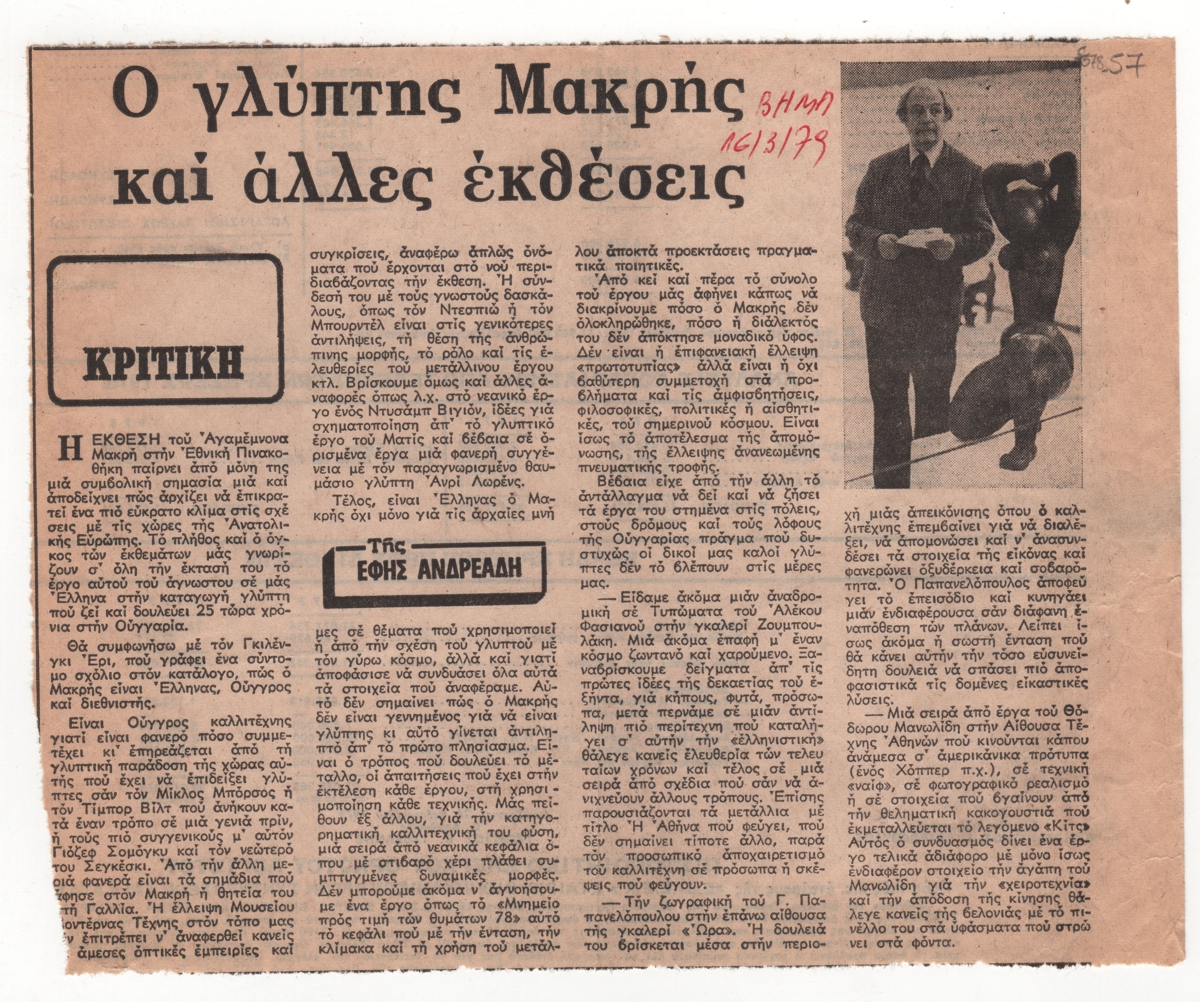 Απόκομμα, έντυπο, στα ελληνικά, χαρτί, 17,5×21,7 εκ. Κριτική της Έφης Ανδρεάδη για το έργο του γλύπτη Μέμου Μακρή με αφορμή την αναδρομική έκθεση έργων του στην Αθήνα το 1979. Στο ίδιο δημοσίευμα περιλαμβάνονται επίσης: κριτική για την αναδρομική έκθεση τυπωμάτων του Αλέκου Φασιανού, την ατομική έκθεση ζωγραφικής του Γ. Παπανελόπουλου και την έκθεση έργων του Θόδωρου Μανωλίδη στην Αθήνα την ίδια περίοδο. Επάνω, επιγραφή με τα στοιχεία της δημοσίευσης.