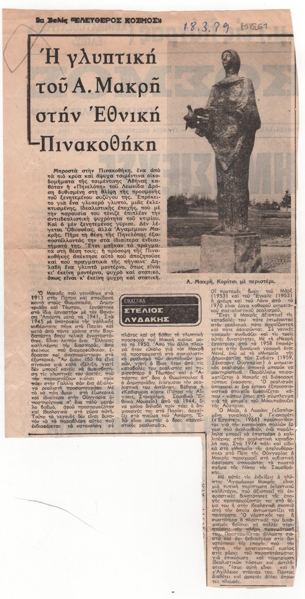 Απόκομμα της εφημερίδας “Ελεύθερος Κόσμος” (18/03/1979), όπου δημοσιεύεται κριτική του Στέλιου Λυδάκη για την αναδρομική έκθεση γλυπτικής του Μέμου Μακρή στην Εθνική Πινακοθήκη στην Αθήνα.