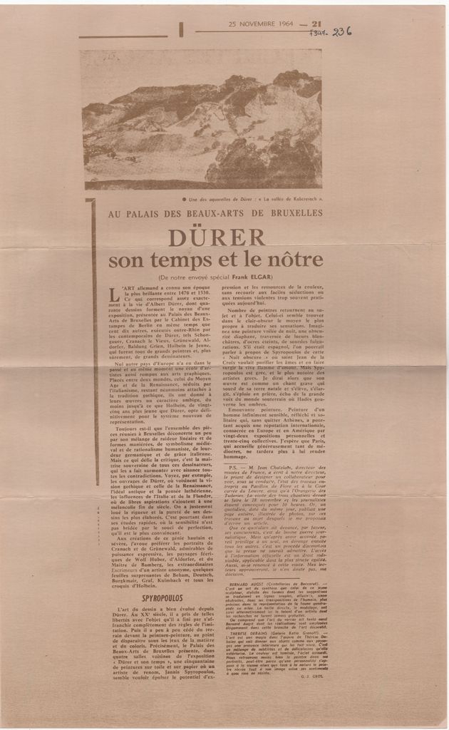 Φωτοαντίγραφο αποκόμματος, έντυπο, όπου δημοσιεύεται, στα γαλλικά, κριτική παράλληλων εκθέσεων έργων του Albrecht Dürer και του Γιάννη Σπυρόπουλου στο Palais des Beaux-Arts των Βρυξελλών το 1964.