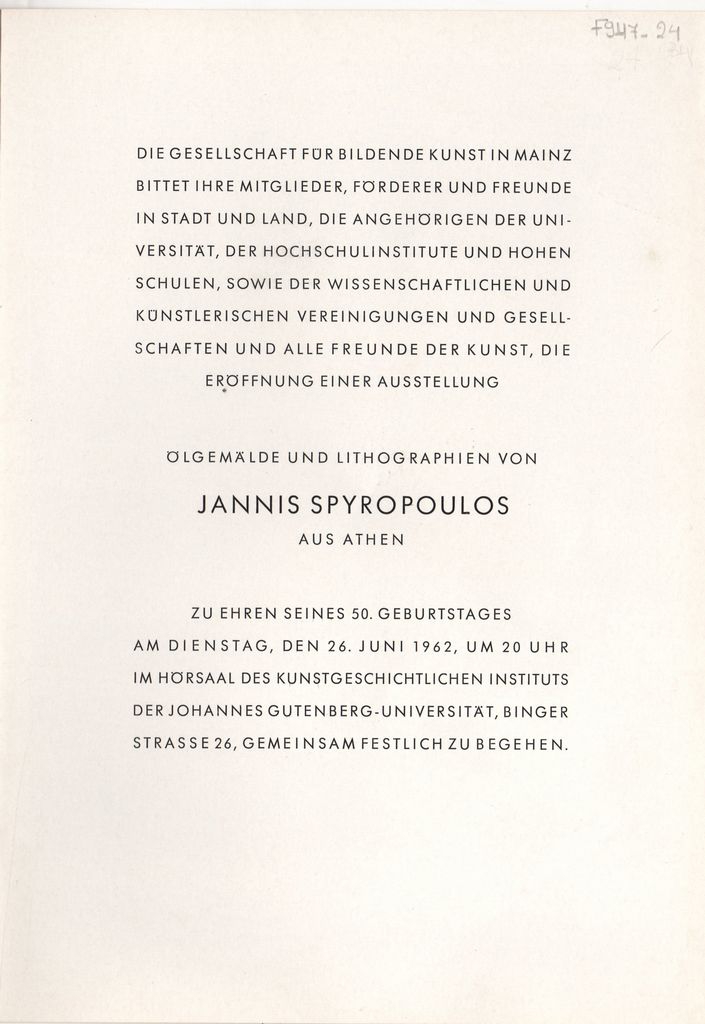 Έντυπο, δίπτυχο, χαρτί ιλουστρασιόν, στα γερμανικά, 21,0×15,0 εκ. Πρόσκληση εγκαινίων της ατομικής έκθεσης ζωγραφικής και λιθογραφίας του Γιάννη Σπυρόπουλου στο Mainz το 1962. Στην τελετή των εγκαινίων συμμετείχαν ως ομιλητές ο Θεμιστοκλής Τσάτσος, με την ιδιότητα του έλληνα πρέσβη στη Γερμανία και ο ιστορικός τέχνης Friedrich Gerke με θέμα “Jannis Spyropoulos. Ein griechischer Beitrag zur abendländischen Malerei unserer Zeit”.