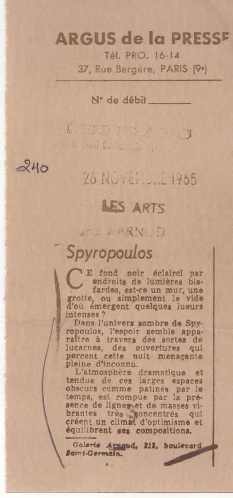 Φωτοαντίγραφο αποκόμματος, έντυπο, χαρτί, 14,8×6,0 εκ., όπου δημοσιεύεται, στα γαλλικά, κριτική της ατομικής έκθεσης ζωγραφικής του Γιάννη Σπυρόπουλου στην Galerie Arnaud στο Παρίσι το 1965. Επάνω, απόκομμα του πρακτορείου αποδελτίωσης τύπου Argus de la Presse με τα στοιχεία της δημοσίευσης.