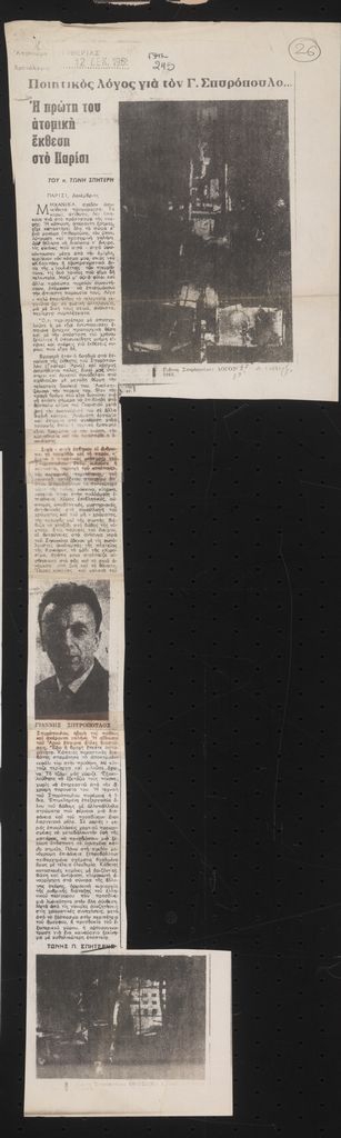 Φωτοαντίγραφο αποκόμματος, έντυπο, 62,0×18,3 εκ., όπου δημοσιεύεται, στα ελληνικά, κριτική της ατομικής έκθεσης ζωγραφικής του Γιάννη Σπυρόπουλου στο Παρίσι το 1965. Επάνω, απόκομμα με τα στοιχεία της δημοσίευσης.