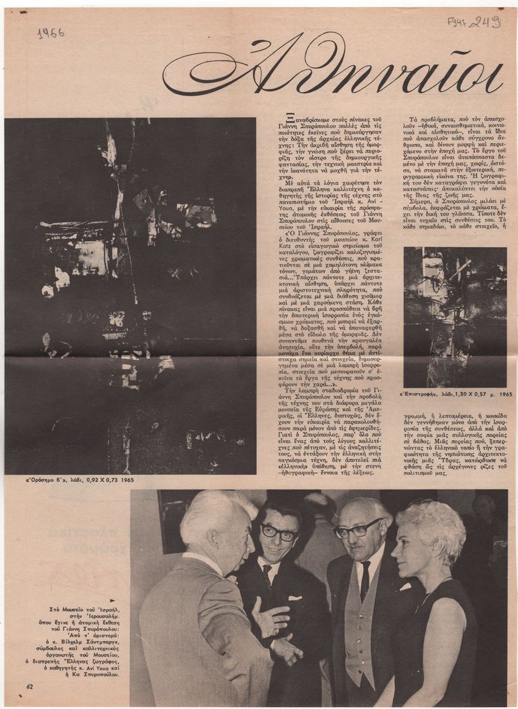 Απόκομμα, έντυπο, χαρτί, 33,5×24,5 εκ., όπου δημοσιεύεται, στα ελληνικά, ανταπόκριση από τα εγκαίνια της ατομικής έκθεσης του Γιάννη Σπυρόπουλου στο Μουσείο του Ισραήλ στην Ιερουσαλήμ.