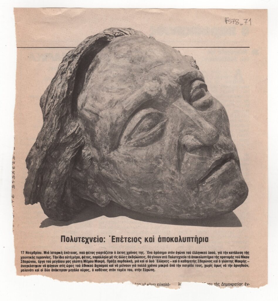 Απόκομμα εντύπου, στα ελληνικά, χαρτί, 18,2×17,0 εκ. Αναφορά στον εορτασμό του έκτου χρόνου από την επέτειο του Πολυτεχνείου στα πλαίσια της οποία έγιναν και τα αποκαλυπτήρια της προτομής του Νίκου Σβορώνου που φιλοτέχνησε ο Μέμος Μακρής. Εικονογραφείται με αναπαραγωγή του έργου.