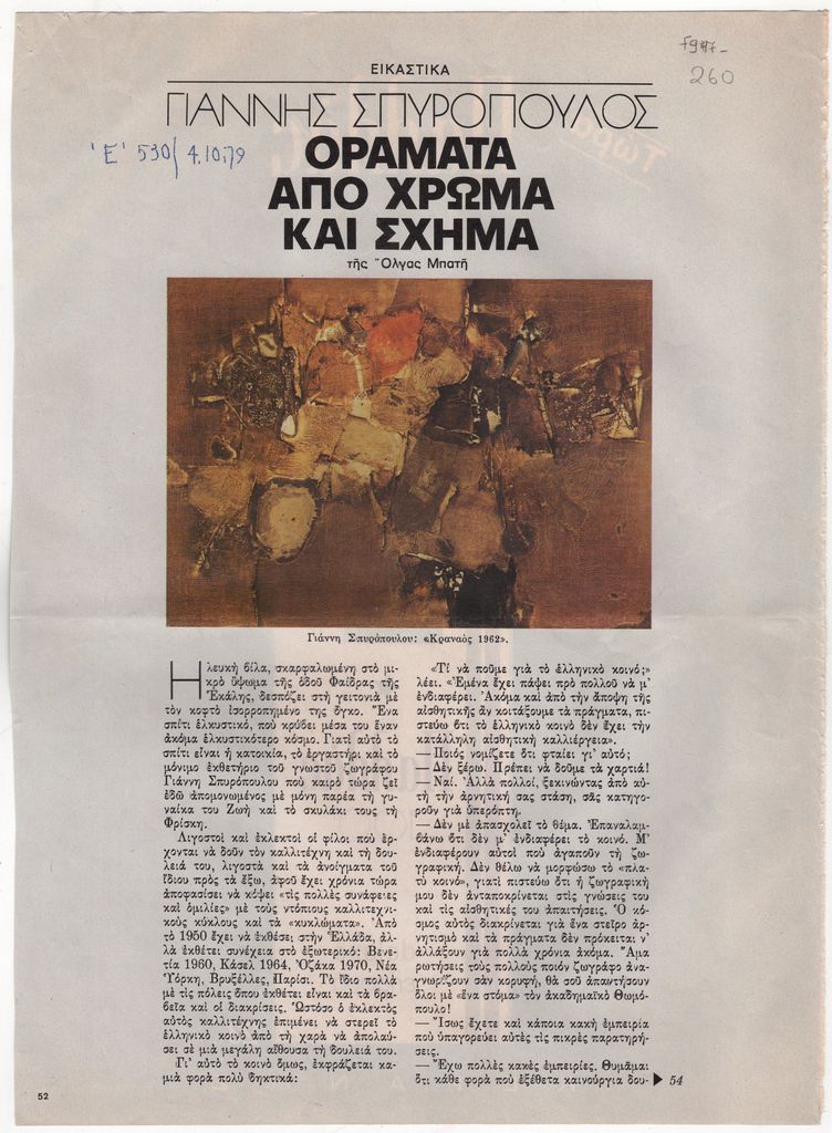 Απόκομμα, έντυπο, χαρτί ιλουστρασιόν, 2 φφ., 29,8×22,0 εκ., όπου δημοσιεύεται, στα ελληνικά, συνέντευξη του ζωγράφου Γιάννη Σπυρόπουλου στην Όλγα Μπατή. Στην πρώτη σελίδα, επιγραφή με τα στοιχεία της δημοσίευσης.
