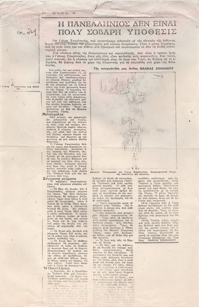 Φωτοαντίγραφο αποκόμματος, έντυπο, χαρτί, 32,7×21,5 εκ., όπου δημοσιεύεται, στα ελλληνικά, συνέντευξη του ζωγράφου Γιάννη Σπυρόπουλου στη Θάλεια Σπηλιάκου με αφορμή την ατομική έκθεσή του στην Κύπρο.