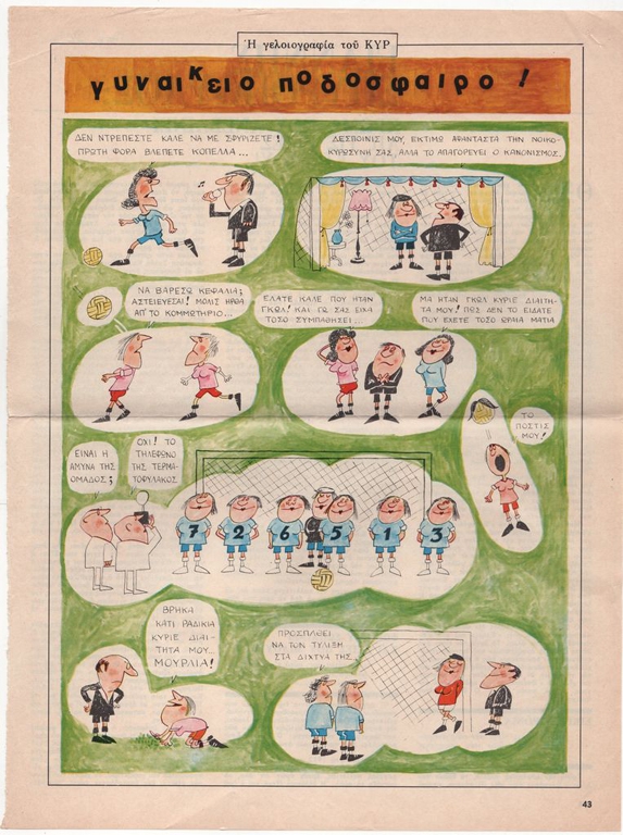 Απόκομμα, έντυπο, χαρτί ιλουστρασιόν, 4 φφ, 31,0×23,2 εκ., όπου δημοσιεύεται έγχρωμη, γελοιογραφία του ΚΥΡ με τίτλο “Γυναικείο Ποδόσφαιρο”. Στις υπόλοιπες όψεις του τεκμηρίου δημοσιεύεται άρθρο της Μαριάνας Μουτζουρίδου για τον ζωγράφο Γιάννη Σπυρόπουλο.