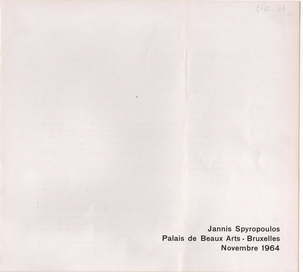 Απόκομμα εντύπου, στα αγγλικά, χαρτί ιλουστρατιόν, 19,8×21,8 εκ., της ατομικής έκθεσης ζωγραφικής του Γιάννη Σπυρόπουλου στις Βρυξέλλες το 1964. Περιέχει κείμενο του Michel Ragon για τον καλλιτέχνη.