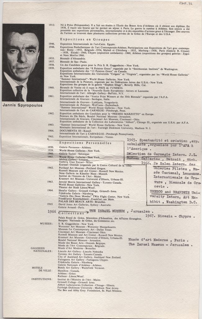 Απόκομμα εντύπου, στα γαλλικά, χαρτόνι, 33,5×21,5 εκ. Αφορά στην ατομική έκθεση ζωγραφικής του Γιάννη Σπυρόπουλου στην Galerie Arnaud στο Παρίσι το 1965. Περιέχει βιογραφικό του καλλιτέχνη με δακτυλόγραφες προσθήκες.