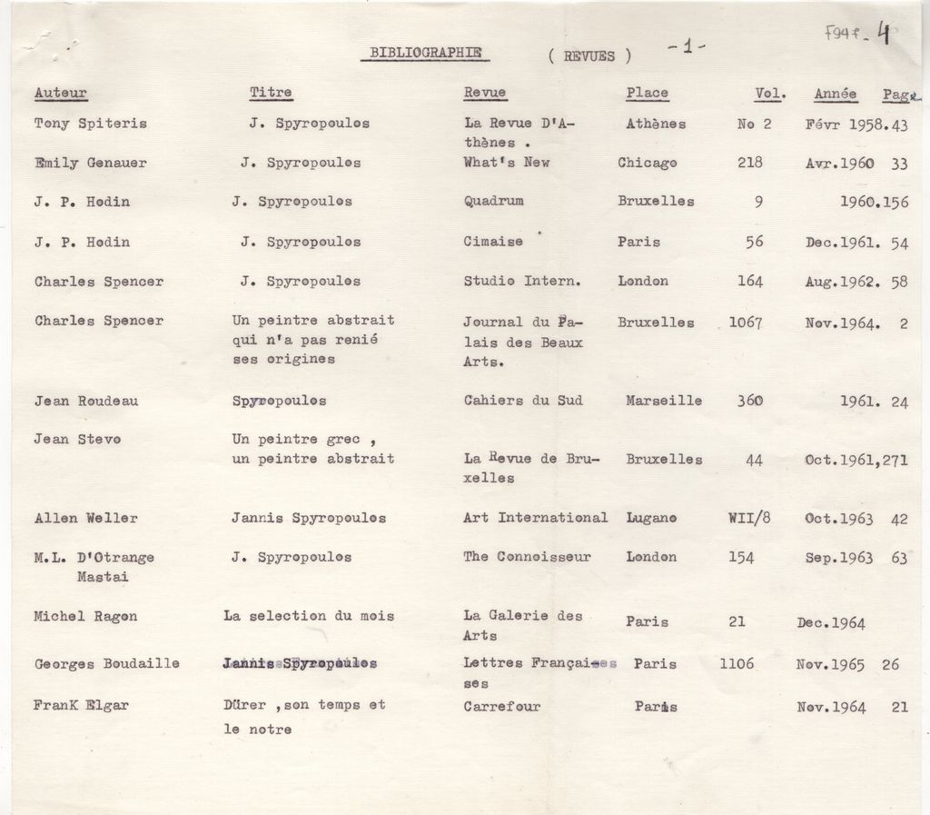 Κείμενο, δακτυλόγραφο, στα γαλλικά, σε αποκόμματα χαρτιού, 9 τμήματα, 21,5×24,0 εκ. Κατάλογος βιβλιογραφικών τίτλων που αφορούν στο έργο του Γιάννη Σπυρόπουλου, κριτικών κειμένων που δημοσιεύτηκαν σε καταλόγους εκθέσεων, καθώς και λημμάτων σε έργα αναφοράς για τον καλλιτέχνη. Καλύπτεται η περίος 1958-1967.