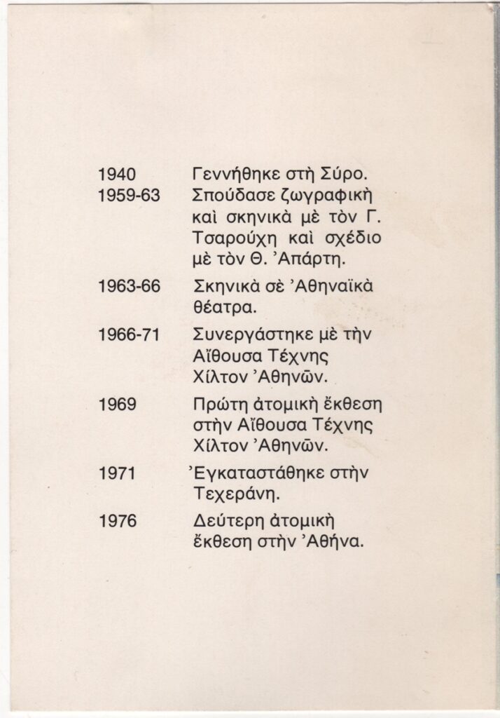 Έντυπο, στα ελληνικά, δίπτυχο, χαρτόνι, 16,8×11,6 εκ. Πρόσκληση της ατομικής έκθεση ζωγραφικής του Μιχάλη Μακρουλάκη στην Αθήνα το 1976. Περιέχει σύντομο κείμενο της Νίκης Λοϊζίδη για τον έργο του καλλιτέχνη και βιογραφικό σημείωμα οργανωμένο χρονολογικά. Το εξώφυλλο εικονογραφείται με αναπαραγωγή έργου.