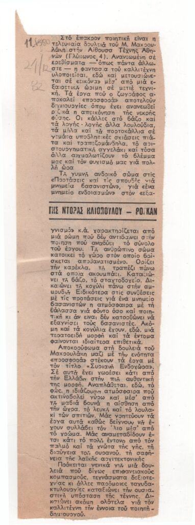 Απόκομμα, έντυπο, στα ελληνικά, χαρτί, 21,2×6,5 εκ. Κριτική της Ντόρας Ηλιοπούλου-Ρογκάν για την ατομική έκθεση ζωγραφικής του Μιχάλη Μακρουλάκη στην Αθήνα το 1982. Αριστερά, επιγραφή με την ημερομηνία της δημοσίευσης.
