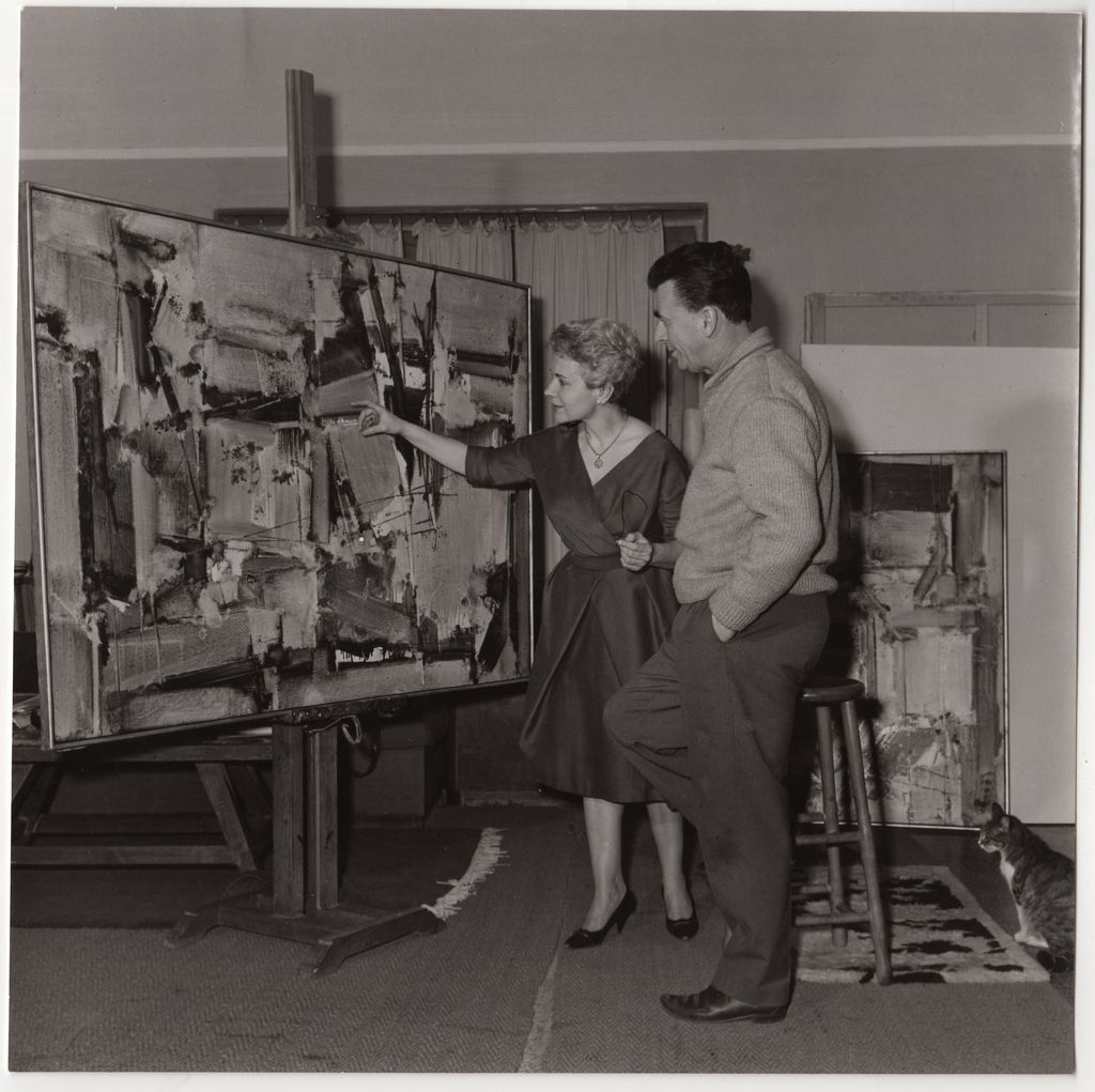 Φωτογραφία, α/μ, φωτογραφικό χαρτί, 17,3×17,2 εκ. Ο ζωγράφος Γιάννης Σπυρόπουλου με τη σύζυγός του Ζωή στο εργαστήριο του καλλιτέχνη. Στην πίσω όψη, ιδιόγραφη αφιέρωση στο ζεύγος Σπητέρη και σφραγίδα του φωτογράφου Μάκη Σκιαδαρέση.