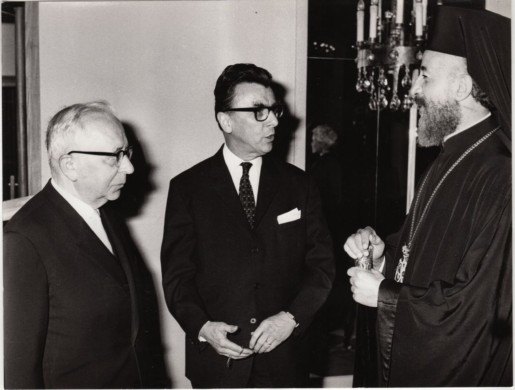 Φωτογραφία, α/μ, φωτογραφικό χατρτί, 18,5×24,0 εκ. Στιγιότυπο από τα εγκαίνια της ατομικής έκθεσης του Γιάννη Σπυρόπουλου στη Λευκωσία, 06/04/1967. Στη φωτογραφία: ο Αρχιεπίσκοπος Μακάριος, ο ζωγράφος και ο Υπουργός Παιδείας Κύπρου κ. Κ. Σπυριδάκις. Στην πίσω όψη, επιγραφή με τα στοιχεία της φωτογραφίας και σφραγίδα του φωτογραφικού πρακτορείου Ξένοι Φωτορεπόρτερς.