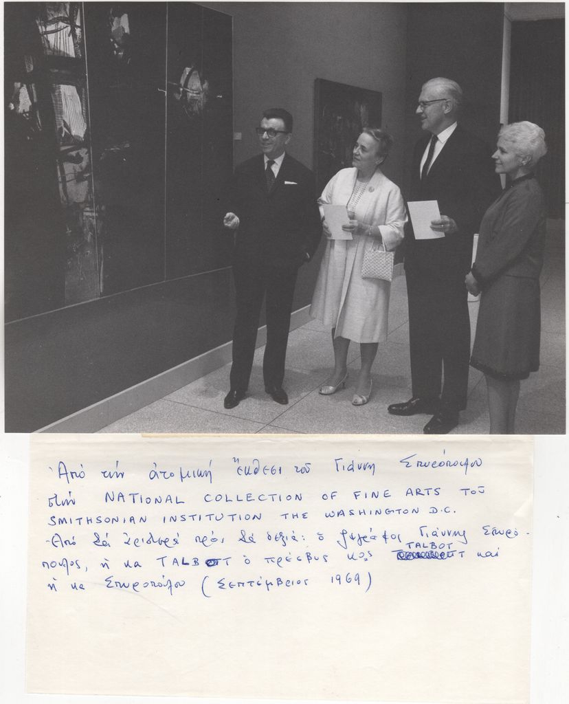 Φωτογραφία, α/μ, φωτογραφικό χαρτί, 18,4×23,7 εκ. Στιγμιότυπο από την ατομική έκθεση του Γιάννη Σπυρόπουλου στην Washington D.C., 09/1969. Στη φωτογραφία: ο ζωγράφος, o πρεσβευτής των Η.Π.Α. στην Ελλάδα W. Talbot με τη σύζυγό του και η κ. Σπυροπούλου. Στην πίσω όψη, σημείωση με τα στοιχεία της φωτογραφίας.