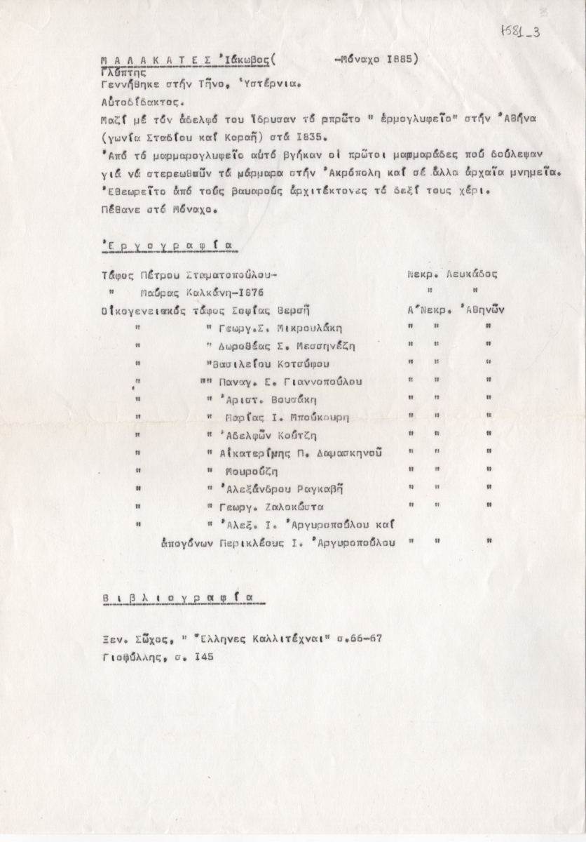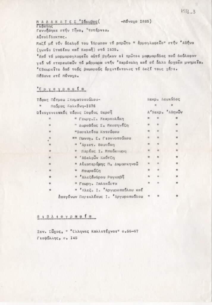 Κείμενο, στα ελληνικά, δακτυλόγραφο, χαρτί, 29,7×21,0 εκ. Βιογραφικό σημείωμα του γλύπτη Ιάκωβου Μαλακατέ. Περιλαμβάνει στοιχεία για την επαγγελματική του δραστηριότητα, εργογραφία και βιβλιογραφία.