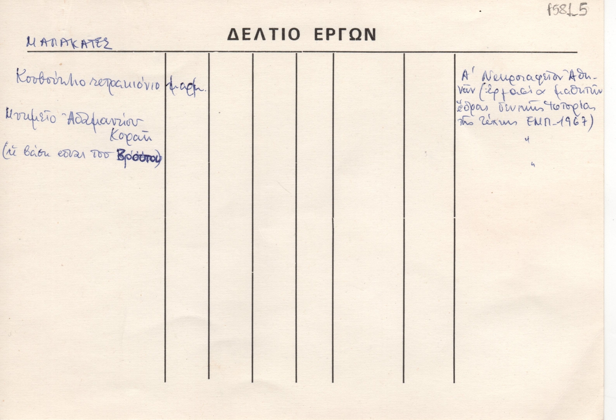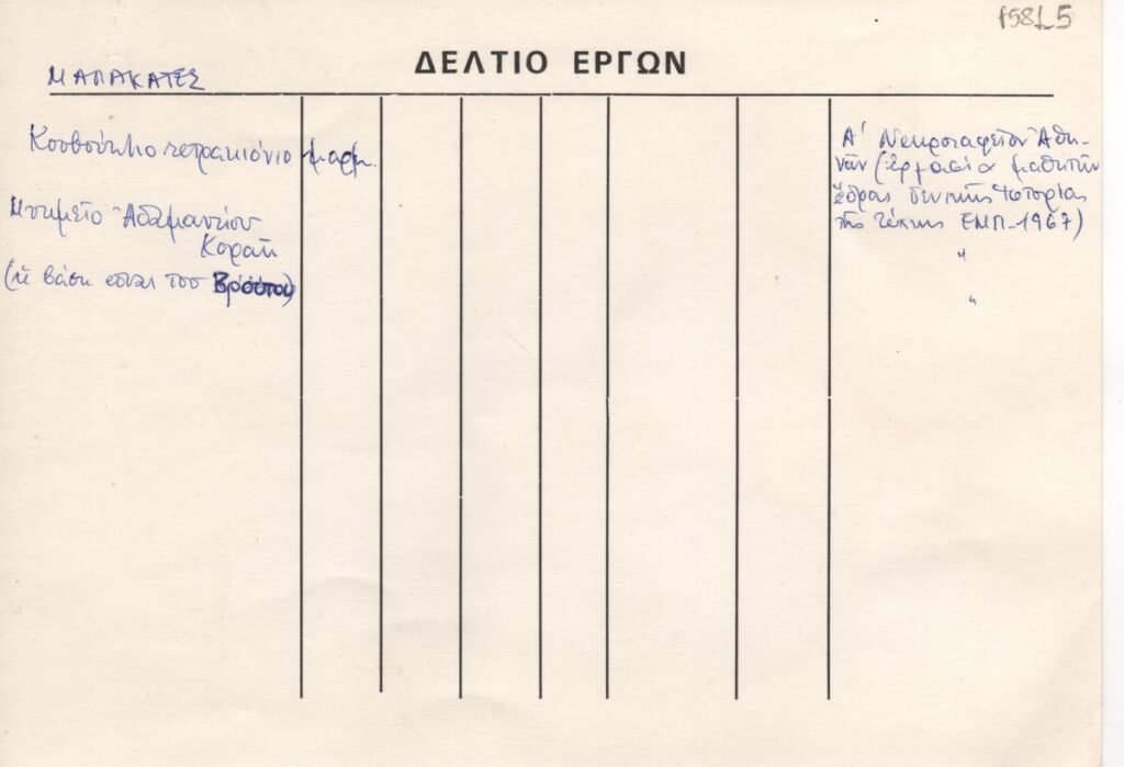 Έντυπο, συμπληρωμένο χειρόγραφα, με μπλε μελάνι, στα ελληνικά, χαρτόνι, 14,0×20,0 εκ. Αναφέρονται δύο έργα του γλύπτη Ιάκωβου Μαλακατέ με βιβλιογραφία.