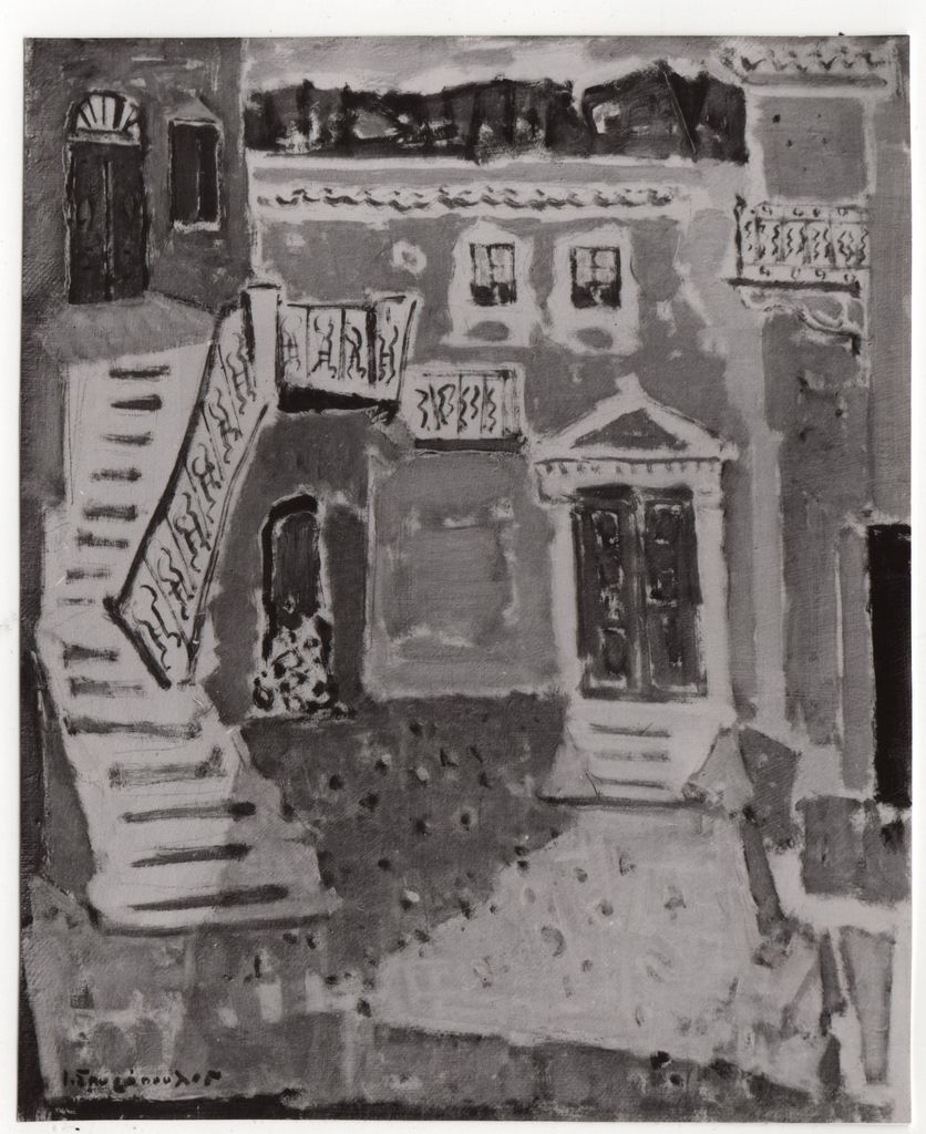 Φωτογραφία, α/μ, φωτογραφικό χαρτί, 17,0×20,4 εκ. Αναπαραγωγή έργου του Γιάννη Σπυρόπουλου, 1952-1954. Στην πίσω όψη, σημειώση με τα στοιχεία της χρονολόγησης.