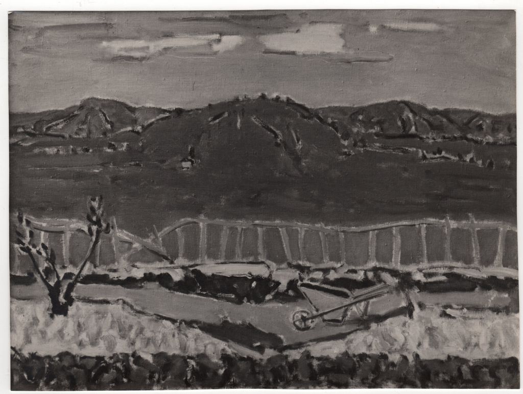 Φωτογραφία, α/μ, φωτογραφικό χαρτί, 16,3×21,6 εκ. Αναπαραγωγή του έργου του Γιάννη Σπυρόπουλου “Τοπίο”. Στην πίσω όψη, σημείωση με τα στοιχεία του έργου, όπου αναφέρεται ότι το έργο παρουσιάστηκε σε Πανελλήνια Έκθεση.