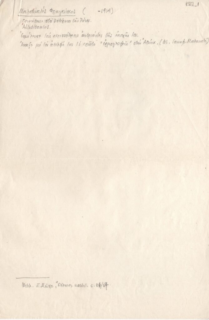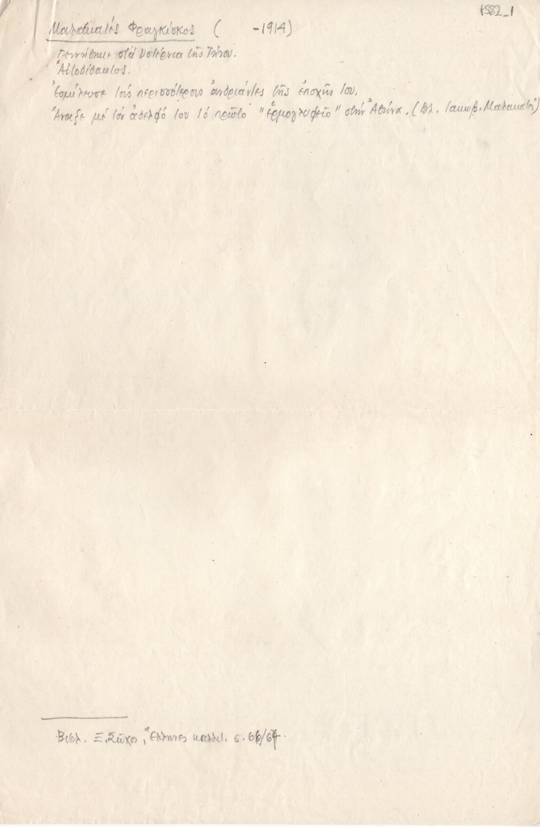 Κείμενο, χειρόγραφο, με μολύβι, στα ελληνικά, χαρτί, 30,0×19,8 εκ. Συνοπτικά βιογραφικά στοιχεία για τον γλύπτη Φραγκίσκο Μαλακατέ και βιβλιογραφία.
