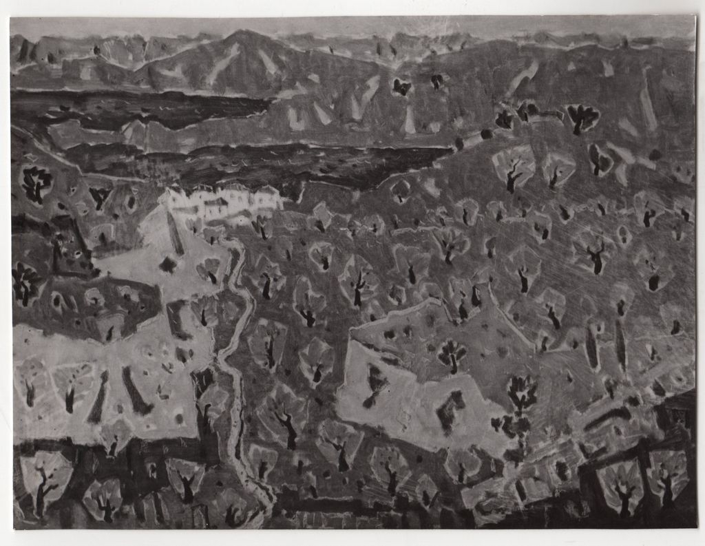 Φωτογραφία, α/μ, φωτογραφικό χαρτί, 11,3×15,0 εκ. Αναπαραγωγή έργου του Γιάννη Σπυρόπουλου, 1954-1955. Στην πίσω όψη, σημείωση με τα στοιχεία χρονολόγησης.