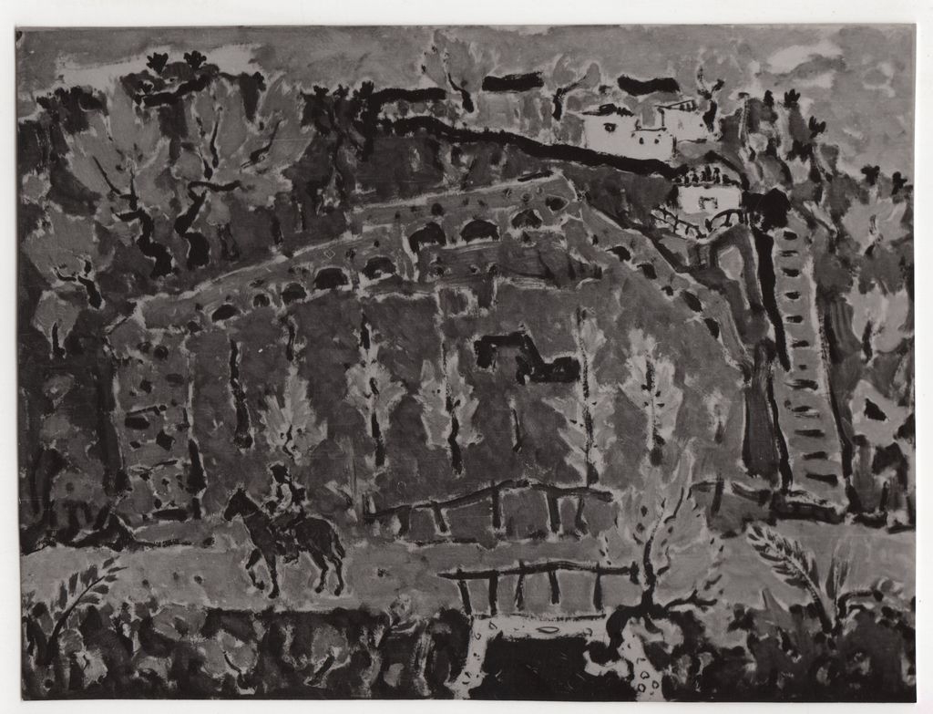 Φωτογραφία, α/μ, φωτογραφικό χαρτί, 11,0×14,8 εκ. Αναπαραγωγή έργου του Γιάννη Σπυρόπουλου, 1954-1955. Στην πίσω όψη, σημείωση με τα στοιχεία χρονολόγησης.