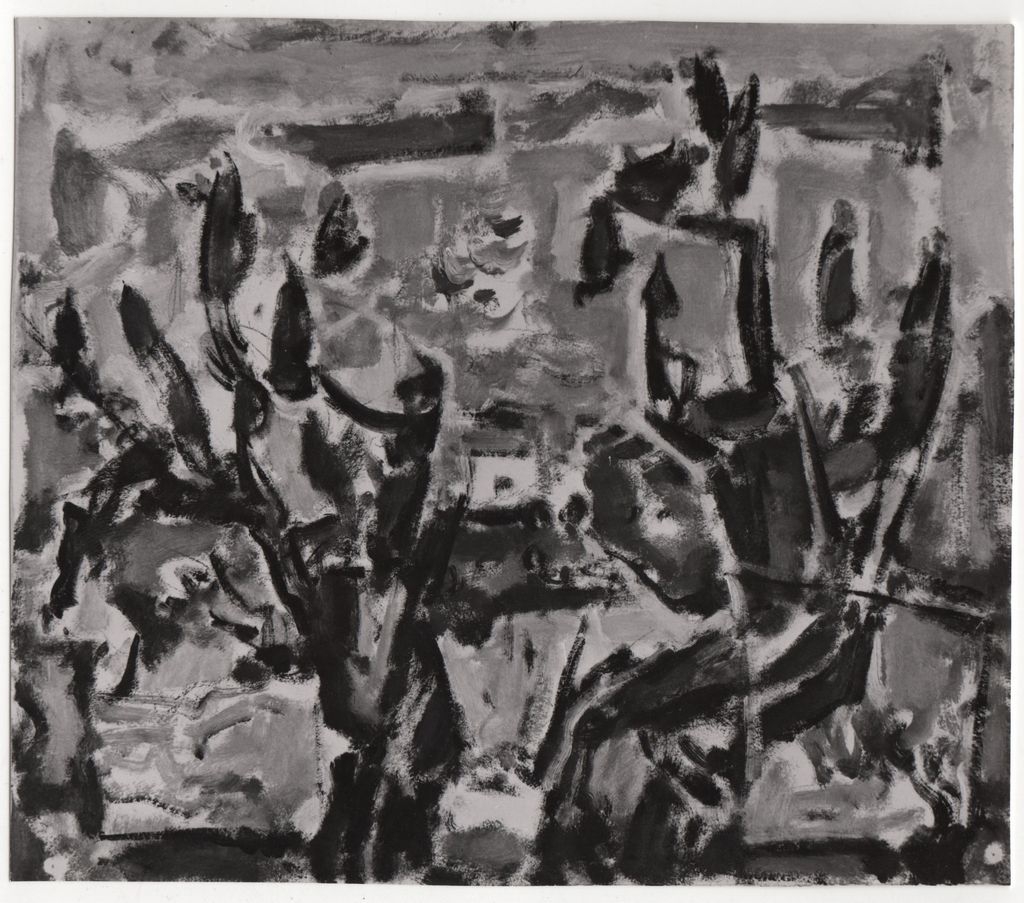Φωτογραφία, α/μ, φωτογραφικό χαρτί, 12,2×14,0 εκ. Αναπαραγωγή έργου του Γιάννη Σπυρόπουλου, 1957. Στην πίσω όψη, σημείωση με τα στοιχεία χρονολόγησης.